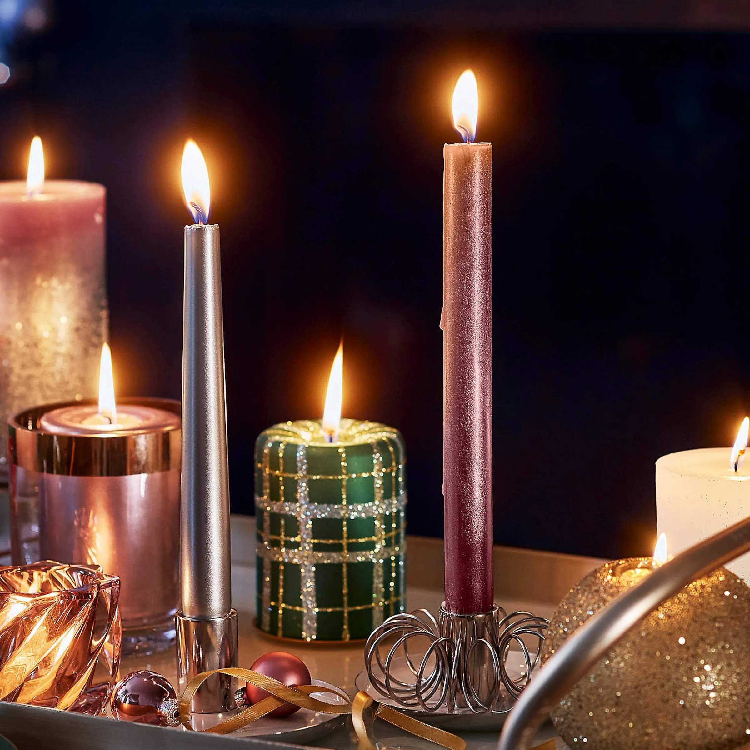 Diese Exklusive Stabkerze Im Metallic-Gewand Sorgt Für Einen Hauch Von Eleganz In Deinem Zuhause. Besonders Gut Passt Sie Zu Silbernen Kerzenstandern, Aber Auch Schwarze Metallkranze Harmonieren Mit Ihr. Die Brenndauer Betragt Stattliche 9 Stunden Und Das Sollte Doch Für Einen Ausgedehnten, Romantischen Abend Bei Kerzenschein Genau Reichen, Oder?