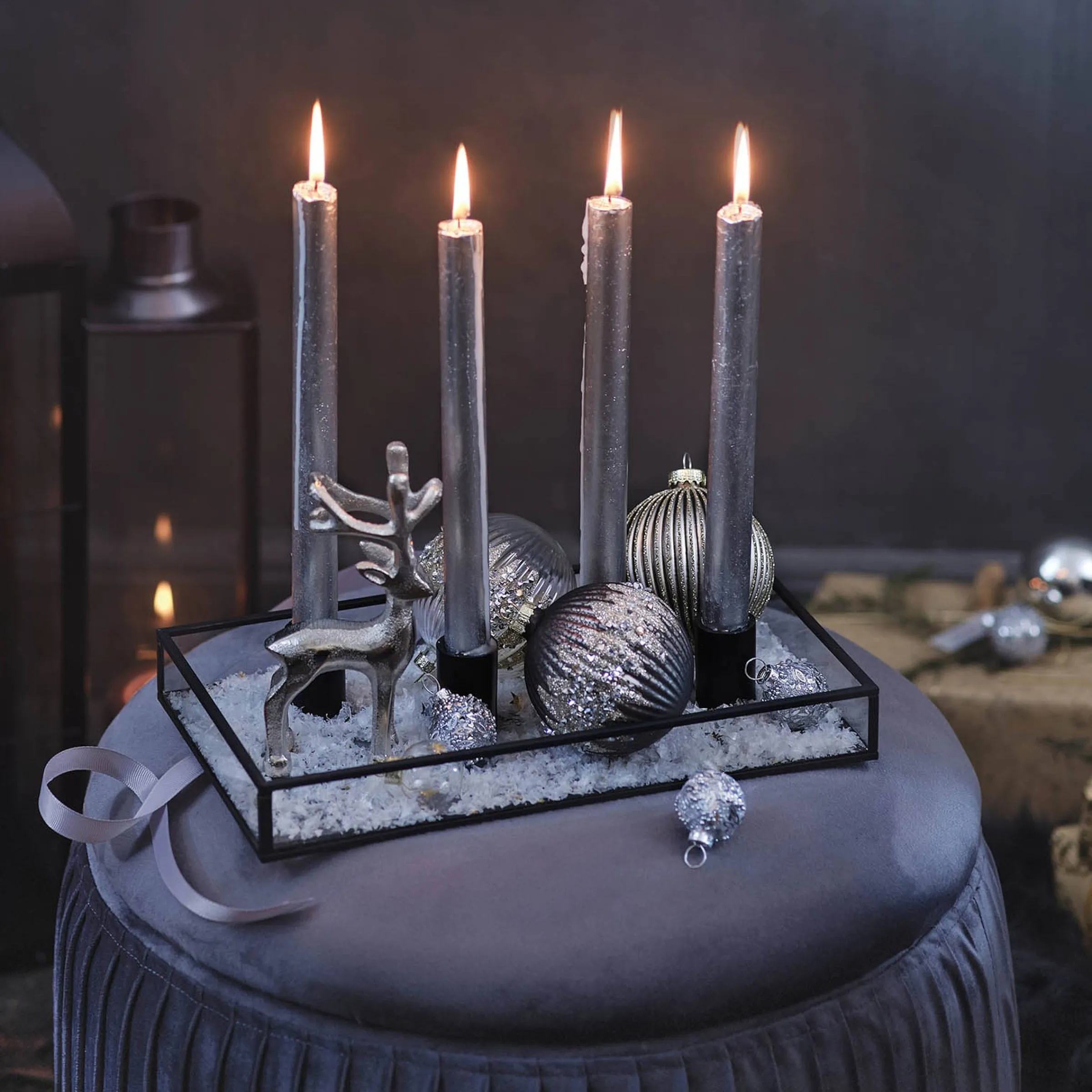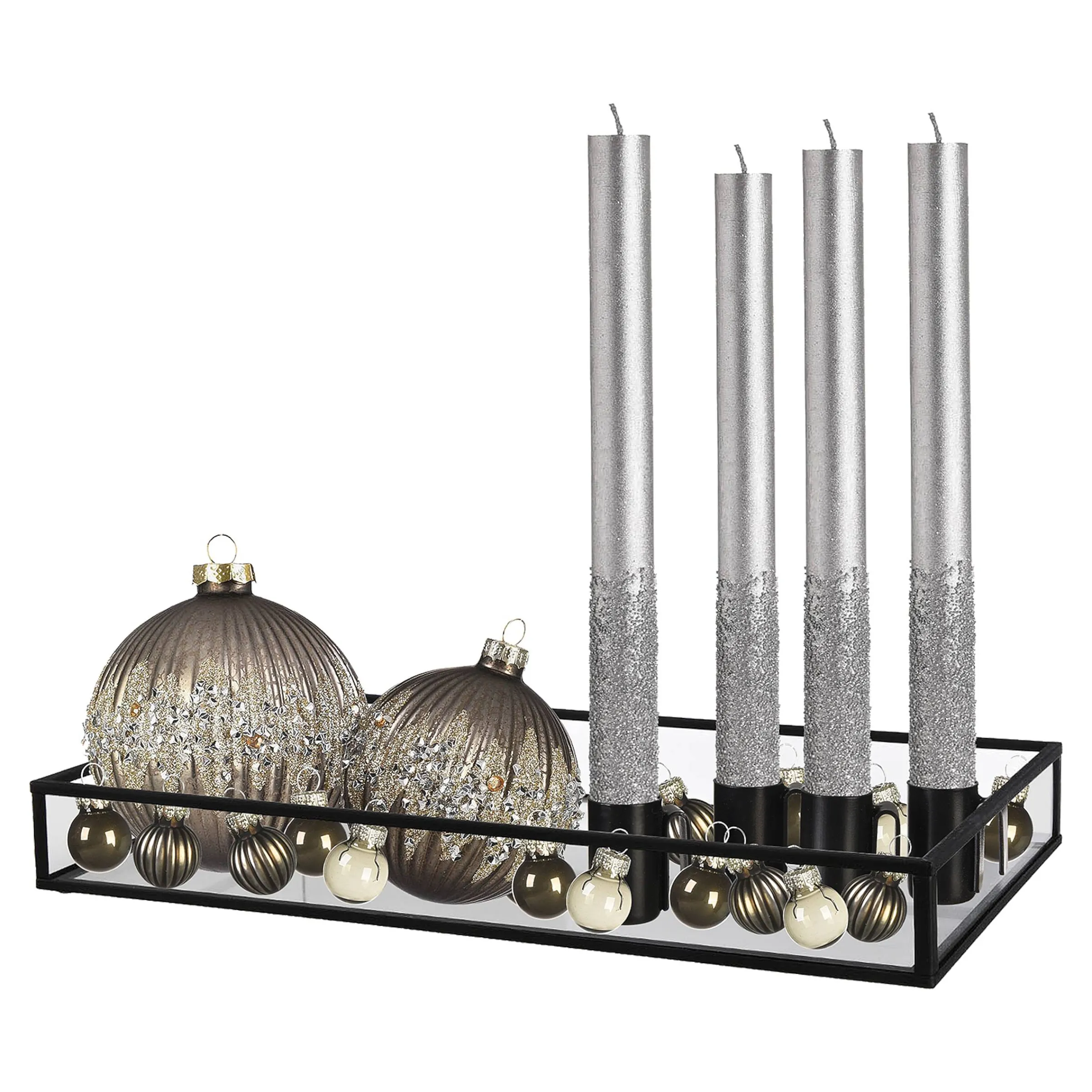 Das Lasst Das Herz Aller Glamour-Queens Hoher Schlagen: Ein Hochwertiges Glas-Tablett Mit Allerlei Glitzernder Deko Darauf. Neben Den Silberfarbenen Stabkerzen Mit Glitzergranulat, Sind Auch Die Im Set Enthaltenen Grosen Weihnachtskugeln Groszugig Beglimmert. Zum Ausgleich Gibt Es Noch Ein Set Aus 15 Minikugeln Im Etwas Schlichteren, Sehr Edlen Look Mit Dazu!