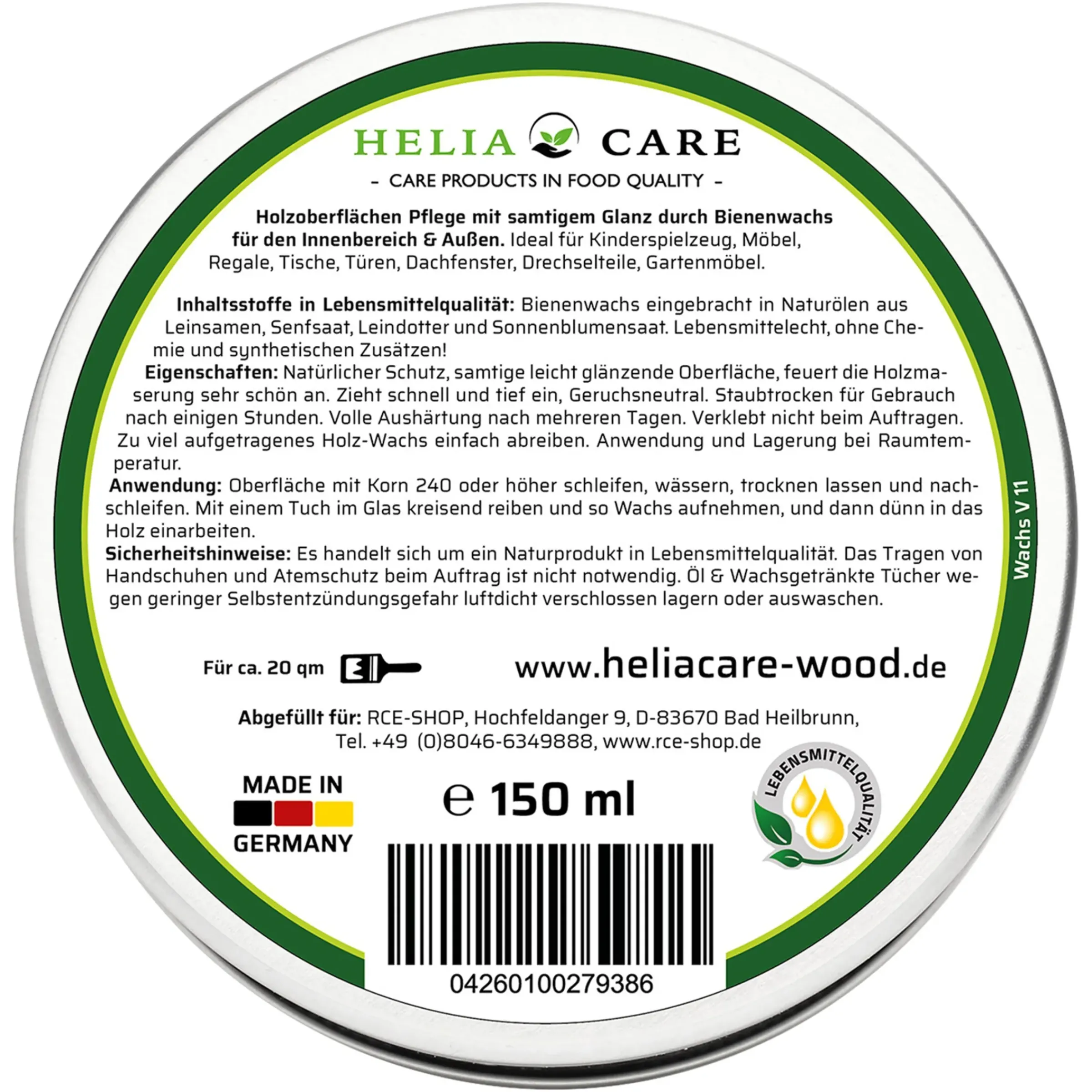 Premium Holz Wachs In Lebensmittelqualitat – Frei Von Chemie Und Zusatzstoffen!Das Heliacare Premium Holz-Wachs Ist Ein Neuartiges Naturprodukt, Das Mit Dem Ansatz „Von Der Natur – Für Die Natur“ Nachhaltig Entwickelt Wurde. Es Schutzt Ihre Holzwerkstucke, Gartenmöbel, Schneidebretter Und Arbeitsplatten, Innen Und Ausen. Dabei Erzeugt Das Holz-Wachs Eine Wunderschone Schutzschicht Mit Einem Leicht Seidigen Glanz. Durch Ein Spezielles Verfahren Konnten Wir In Das Bienenwachs Etwas Pflege Ol Einarbeiten, Welches Die Eigenschaft Hat, Die Holzoberflache Zu Schutzen. Das Wachs Hartet Aus Und Bildet Einen Sehr Schonen Samtigen Glanz.
