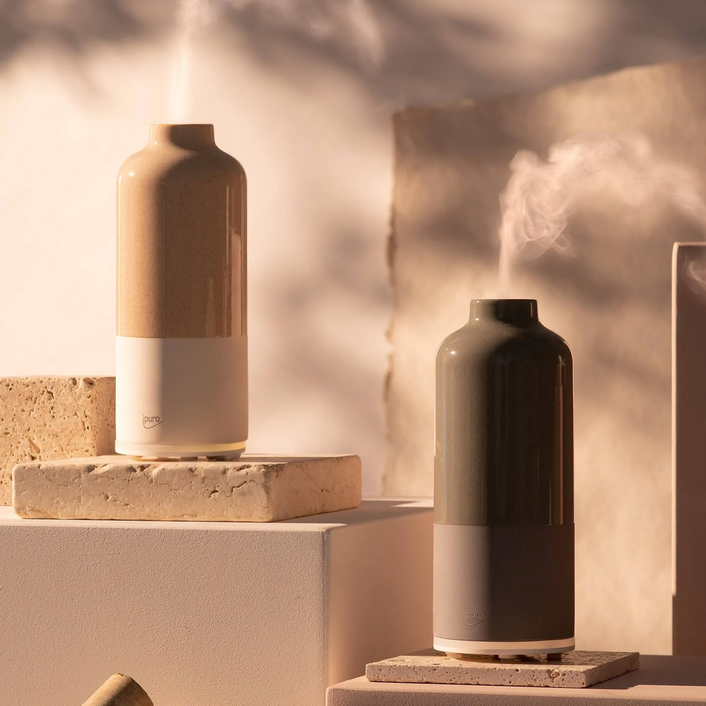 Innovativ, Beruhrend, Personlich – Der Handglasierte Ipuro Air Sonic Aroma Bottle Diffuser In Angesagter Two-Tone Keramikoptik. Warmweis- Und Farbiges Licht In 3 Helligkeitsstufen.